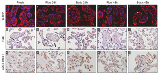 CD34 class II staining was used to visualize endothelial cells of vessels within villous explants (Figure 2K–O). Freshly dissected explants displayed clearly defined and normally arranged endothelial cells aiding to identify capillaries and larger blood vessels (Figure 2K). In the static cultured explants for 24 h, more damaged and disrupted vessels were found, and this collapsed appearance increased if static cultivation lasted for 48 h (Figure 2M,O, arrowheads). In comparison to the static culture, the appearance of blood vessels within the explants cultured under flow conditions represented a stage close to blood vessels in freshly dissected explants. This was indicated by the presence of still preserved structural integrity of vessel lining after 24 h and 48 h of flow cultivation (Figure 2L,N).