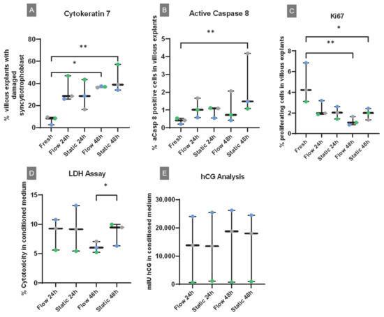 Histological and biochemical integrity and degeneration of placental tissue upon cultivation. For the quantitative analysis of each staining, twelve random spots from the explants were photographed and included for analysis. The median and all data points are shown. The same placenta is color-coded in every condition (gray, blue, green). (A) Cytokeratin 7 staining was used to stain villous trophoblast and assess the detachment of this layer from the villous core of villi. There was a significant increase in the amount of detached syncytiotrophoblast in cultured tissues after 48 h in both conditions. The quantification of damaged syncytiotrophoblast around villous explants was performed manually by means of counting villi with detached syncytiotrophoblast versus villi with intact syncytiotrophoblast. (B) The quantification of active caspase 8 was performed automatically using the software HALO and counting caspase-positive and caspase-negative cells in the whole tissue area. A small percentage of early apoptotic cells was found in fresh tissues. In tissues cultured under flow conditions, no significant increase of early apoptosis was found, while there was a time-dependent increase in early apoptosis in tissues cultured under static conditions. (C) Quantification of Ki67 staining was performed automatically using the software HALO and counting Ki67 positive and Ki67 negative nuclei in the whole tissue area. A high amount of proliferating cells was found in fresh tissues. Significantly decreased levels of proliferating cells were found in flow and static cultured tissue after 48 h of culture. (D) An LDH assay was performed to measure necrosis in the tissue cultivated under flow or static conditions. Aside from some variations, there was a significant increase in the necrotic release of LDH in static cultured tissues compared to flow cultured tissues after 48 h of culture. Three independent experiments were used for this analysis, and measurements were done in duplicates. (E) Endocrine function was assessed by hCG measurements in the conditioned media. There were no statistically significant differences between the samples. The same three independent experiments as for the LDH assay were used for this analysis. * p < 0.05, ** p < 0.01.