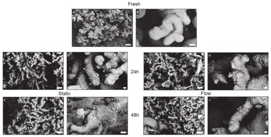 Scanning electron microscopy was performed to analyze the surface of placental villi in detail (Figure 5A–J). Freshly dissected explants mostly displayed a dense microvillous surface accompanied by occasional singular, small vesicular-like structures (Figure 5A,B). After 24 h of static culture, a clearly reduced number of microvilli was observed, which partially appeared shriveled (Figure 5C,D). Moreover, vesicular-like structures occasionally appeared withered and accumulated. The appearance of the tissue dramatically worsened after 48 h of static culture, as indicated by the increased presence of non-released, accumulated vesicles and the increased appearance of a stunned, disintegrated microvillous surface (Figure 5E,F). The surface of placental explants was also affected after 24 h of flow culture indicated by a slight increase of accumulated vesicular-like structures, mostly in niches between villi. In addition, the number of microvilli on the surface of villi seemed to be slightly reduced (Figure 5G,H). After 48 h of flow culture, the appearance of the tissue did not really change or even worsen compared to the appearance of the explants in the flow culture after 24 h (Figure 5I,J). In flow culture, the villi showed less accumulations of still attached vesicular-like structures, indicating a washing effect of the flowing media similar to the in vivo situation (Figure 5).