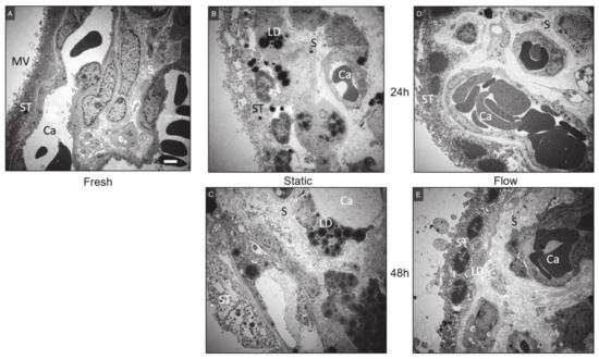 Ultrastructural analysis of representative placental tissue using transmission electron microscopy. (A) In fresh tissue, capillaries (Ca) with erythrocytes and endothelial cells were clearly visible. The stroma (S) appeared dense and diverse cells were identifiable. The syncytiotrophoblast (ST) was visible by its dark gray and dense appearance. This layer showed its characteristic appearance of a multinucleated continuous layer with abundant microvilli on the surface and being attached to the basement membrane. (B) After 24 h of static culture, the syncytiotrophoblast seemed to detach from the basal membrane and nuclei inside appeared condensed, additionally increased appearance of lipid droplets was identified. (C) After 48 h of static culture, accumulation of lipid droplets was found in the cells of the explants. The syncytiotrophoblast was detached from the basement membrane in great extend and appeared loose with hardly identifiable nuclei. Endothelial cells showed vast disintegration. (D) After 24 h of flow culture, the tissue occasionally showed parts of detached and loose syncytiotrophoblast. Capillaries and erythrocytes were still clearly visible, and the stroma mostly appeared dense. (E) After 48 h of flow culture, the stroma still appeared dense with clearly identifiable capillaries and endothelial cells, while a few lipid droplets appeared in stromal cells. The syncytiotrophoblast was mostly attached to the basal membrane and showed some condensed nuclei inside. Scale bar represents 2 μm. MV: Microvilli, ST: Syncytiotrophoblast, Ca: Capillary, S: Stroma, LD: Lipid droplets.