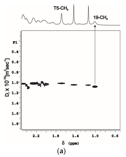 | Sample | Concentration (mM) | 1 (T7-CH3) Integral | 2 (19-CH3) Integral | Di of 1 (10−10 m2 s−1) | Di of 2 (10−10 m2 s−−1) | Ka (mM−1) | % of Complex | |