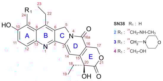- Naumczuk, B.; Kawęcki, R.; Bocian, W.; Bednarek, E.; Sitkowski, J.; Kozerski, L. Preliminary study of mechanism of action of SN38 derivatives. Physicochemical data, evidence of interaction and alkylation of DNA octamer d(GCGATCGC)2. Magn. Reson. Chem. 2017, 55, 128–136. [Google Scholar] [CrossRef] [PubMed]