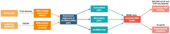 We searched for enriched motifs of RBPs around intersected, differentially expressed circRNA splice sites. The FASTA files of upstream and downstream sequences of circRNA splice sites (1000 bp) were obtained from circBase. Enriched motifs of RBPs in sequences around splice sites were identified in differentially expressed circRNAs using the Analysis of Motif Enrichment (AME), a tool in the MEME Suite software (https://meme-suite.org/meme/tools/ame, accessed on 17 May 2019) [59]. The motifs used for enrichment test were obtained from the CISBP-RNA database [60]. Fisher′s exact test was used as a motif enrichment test, and sequences from the control set of sequences (not differentially expressed circRNAs) were used as control sequences. Motifs with adjusted p-values ≤ 0.05 were considered to be significantly enriched in the tested groups. Enrichment was performed for all upregulated and downregulated circRNAs, as well as for distinct groups of interest (concordant pairs, discordant pairs, circRNA-only).