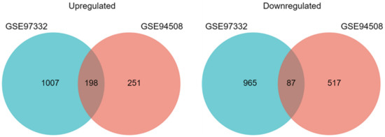 Two microarray datasets (GSE94508 [27] and GSE97332 [28]) were used to identify differentially expressed circRNAs in HCC. Both studies compared circRNA expression in tumor samples vs. adjacent normal tissue samples in five patients (GSE94508) and seven patients (GSE97332). The datasets originated from the same platform: Agilent-069978 Arraystar Human CircRNA microarray V1. We analyzed differentially expressed circRNAs using the GEO2R tool and identified 449 upregulated and 604 downregulated circRNAs in the GSE94508 dataset, and 1205 upregulated and 1052 downregulated circRNAs in the GSE97332 dataset. Subsequently, we intersected results from both datasets to identify high-confidence, differentially expressed circRNAs and used them for further analyses. We identified 197 upregulated and 87 downregulated circRNAs (Figure 2). We also found 424 circRNAs with no change in expression in both datasets and used them as a control group.