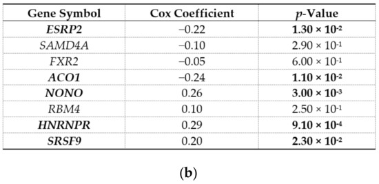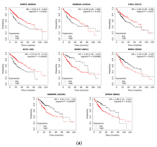 We next hypothesized that RBPs with enriched motifs upstream of differentially expressed, upregulated circRNA sequences are also differentially expressed in HCC and that their expression correlated with patient survival. This would further confirm their potential for driving the splicing patterns in HCC. Indeed, the majority of the identified RBPs (17 out of 22) were differentially expressed in the TCGA-LIHC dataset (Table 4). Four of the differentially expressed RBPs were downregulated (SAMD4A, ESRP2, ACO1, and FXR2), while others were upregulated in HCC. Furthermore, the expression levels of some of the identified RBPs (8 out of 22) were associated with the overall survival of HCC patients from the TCGA-LIHC dataset (Figure 3a). In a multivariate Cox regression analysis adjusted for age, sex, and grade, five RBPs were still significantly associated with the survival of HCC patients (Figure 3b). We observed consistency between the direction of the differential expression of RBPs and the correlation with patient survival. For example, the expression levels of the four downregulated RBPs showed a positive correlation with the overall survival of HCC patients. The expression levels of four upregulated RBPs (NONO, RBM4, HNRNPR, and SRSF9/SFRS9) showed a negative correlation with the overall survival of HCC patients. These RBPs are therefore candidate regulators of circRNA expression with potential oncogenic or tumor-suppressor function in HCC.