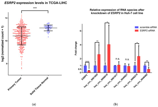 Downregulation of ESRP2 expression in HCC tumors and the effect of this downregulation on circRNA expression. (a) ESRP2 is significantly downregulated in HCC (TCGA-LIHC dataset); (b) The effect of the knockdown of ESRP2 expression in Huh-7, an HCC model cell line, on the expression of the candidate circRNAs. Results from three independent biological triplicates are represented as averages, and error bars represent standard deviation. * p-value ≤ 0.05; ** p-value ≤ 0.01; **** p-value ≤ 0.0001; n.s.—not significant.