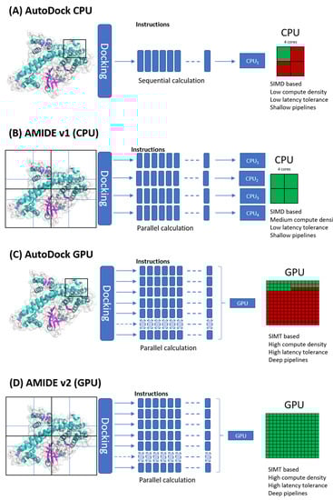 Comparison of AutoDock 4.2 (CPU), AutoDock-GPU and the two versions of AMIDE framework. While AutoDock standalone software can only dock one manually defined box at once (A), the AMIDE protocol automatically cuts the receptor into preselected overlapping boxes. AMIDE v1 boxes were independently sent to all available CPU cores (B). AutoDock-GPU is based on embarrassingly parallel capacities and can obtain multiple docking calculations in input (C). AMIDE v2 is now using GPU based parallelization, allowing time calculation decrease by computing multiple dockings at once (D).