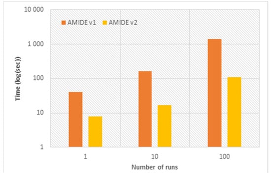 Performance comparison between the two AMIDE versions and depending on the number of docking runs. A log scale is used on the y-axis.