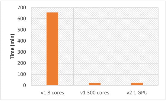 Comparison of the calculation time between the two AMIDE versions. Data were graphed for ligand (4) docked on the T. gondii dataset (87 proteins). The use of a personal PC was represented through the consideration of 8 cores and 1 GPU in the case of AMIDE v1 and AMIDE v2, respectively. The calculation time obtained with AMIDE v1 became as good as the one obtained with AMIDE v2 using 300 cores. The number of docking experiments per box was equal to 20.