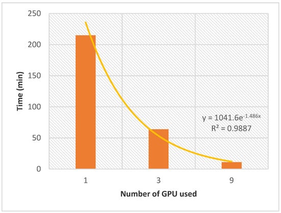 The allocation of a single GPU led to a calculation time of 215 min. The latter was divided by 3.4 and 19.5 when 3 and 9 GPUs were allocated, respectively. The exponential nature of the performance gain as a function of the number of allocated GPUs confirms the potential of AMIDE v2 to support in silico high throughput inverse screening.