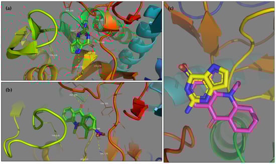 Comparison of the positions of the co-crystallized 9DG ligand (a) and the top ligand 393 (b) on 1FSG protein. Superposition of the poses of the co-crystallized 9DG ligand and the top ligand 393 (c). Both are placed in the same pocket and at least three hydrogen bonds (dashed yellow lines) are highlighted between ligands and residues LYS-178, TYR-205 and ASP-206. π-stacking is observed in the two cases for residue TRP-199.