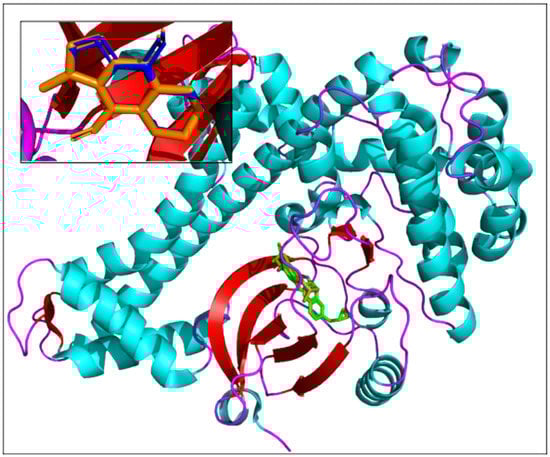 Comparison of experimental and docked poses of the protein associated with 6BFA PDB ID. The co-crystallized ligand is represented in green, and the best poses of ligand (7) are pictured in blue (AMIDE v1) and orange (AMIDE v2). The insert is a zoom-in representing the theoretical poses of ligand (7) in the binding site.