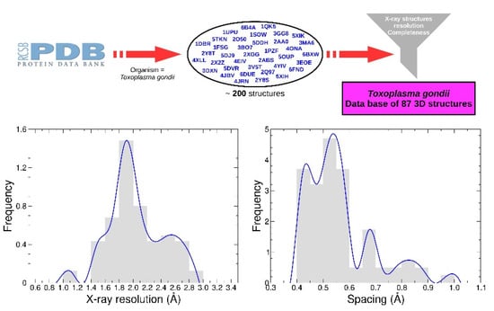 T. gondii protein selection methodology. Protein structures were obtained from the Protein Data Bank. About 200 structures of T. gondii proteins were selected and then filtered according to their acquisition method (X-ray), resolution (less than 3 angstroms), and completeness. The final dataset contains 87 structures whose resolution (graph on the left) and spacing (graph on the right) distribution are presented.