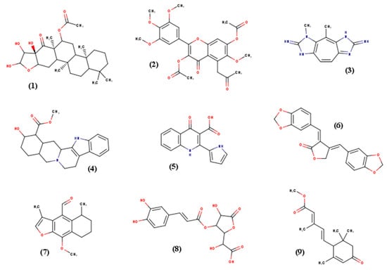 Nine small molecules were selected for this study according to their various chemical classes (atom type, structure) and torsional degrees of freedom (TORSDOF). They were chosen from PNMRNP (Predicted carbon-13 NMR data of Natural Products), a curated and annotated small natural molecules database []. All the relevant characteristics are presented in Table 3, and 2D structures are available in Figure 8. For high-throughput screening assay, French essential National Chemical Library (essential NCL) (https://chembiofrance.cn.cnrs.fr/en/composante/chimiotheque (accessed on 5 April 2021)) was used. The NCL presents more than 75,000 compounds of natural, synthetic or hemisynthetic origin deposited by French academic partner laboratories. The essential NCL represents the chemical diversity of this database through 1040 compounds. These are the ones that have been used here. Within this database, 22 compounds were identified as not compatible with AMIDE because of TORSDOF too high or atypic atom types. Thus, 1018 compounds of essential NCL were used.