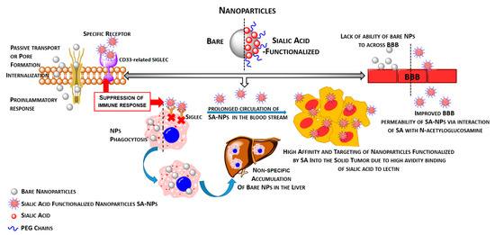 Modulation of the biological functions of nanoparticles after functionalization by sialic acid (SA). The SA-dependent chemical and physical features of NPs promote their activity in the field of immune response, BBB permeability, uptake and neutralization by phagocytes, and delivery to target malignant tissue.