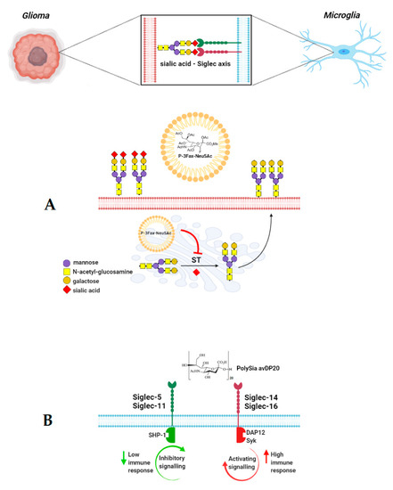 Possible strategies of targeting Siglecs and membrane sialome in glioma management. The administration of fluorinated sialic acid derivatives modulates the expression and activity of sialyltransferases (ST) in Golgi and results in the desialylation of the cell surface (A). Depending on inhibitory or activatory Siglec expression patterns, the binding of specific sialic acid polymers modulates the antitumor immune response (B). DAP12—AX activation protein of 12kDa; Syk—spleen tyrosine kinase; SHP-1—Src homology region 2 domain-containing phosphatase-1; SHP-2—Src homology region 2 domain-containing phosphatase-2.