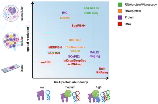 Omics methodologies with regard to RNA/protein abundancy and spatial resolution. Certain technologies allow for a combinatory assessment on RNA and protein level, and microscopic analyses. DBiTSeq, deterministic barcoding in tissue for spatial omics sequencing; FISH, fluorescence in situ hybridization; GeoMx Digital Spatial Profiler technology from NanoString; IMC, imaging mass cytometry; MALDI, matrix-assisted laser desorption/ionization; MERFISH, multiplexed error-robust fluorescence in situ hybridization; Seq, sequencing; smFISH, single-molecule fluorescence in situ hybridization.