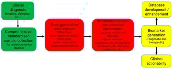 The integrated analysis of protein–protein, gene regulation, and coexpression network models, alongside gene expression data, can lead to the discovery of the most relevant genes and pathways in IMIDS, as well as causal mechanisms and their topological properties [99,100,101,102,103]. On the other hand, enrichment analyses can enable the tracing of pathological mechanisms from the DNA level to the pathophysiological level [99]. For example, assays such as RNA-seq and Chip-seq, which measure gene expression and regulation of gene expression, respectively, have been applied to elucidate tissue-specific signatures of genomic regulation [104]. The clinical application of multi omics data poses major challenges including the joint requirement for expertise and advanced facilities in statistics, biology and computer sciences, as well as the interpretation and therapeutic actionability of molecular findings. However, the integration of multiple omics data types holds a large amount of promise, as it can help to provide a holistic picture of diseases with unprecedented details and guide therapy [99]. Furthermore, DNA and RNA sequencing have been successfully applied to identify gene signatures in tumor versus normal control sample comparisons, which guided therapies that lead to tumor regression [105,106]. The same approaches are likely to yield success if transferred to IMIDs (Figure 2).