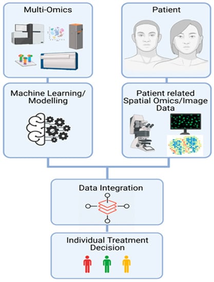 Data Integration. Interdisciplinary setup of multi-omics, spatial transcriptomic, and imaging data including machine learning techniques, providing a platform for individual treatment decisions.