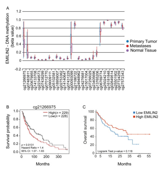 2.1. EMILIN2 Expression Is Epigenetically Modulated in Melanoma and Is Associated with the Patient Outcome