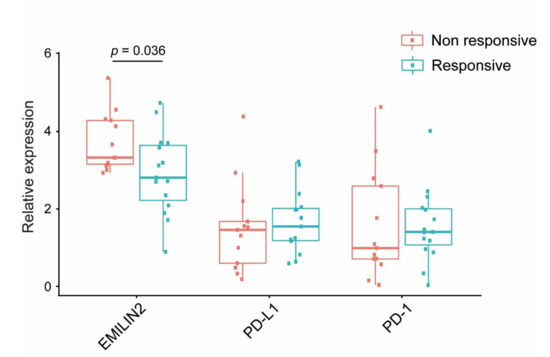 Published preclinical observations indicate that EMILIN-2 regulates vascular efficiency, thus impacting drug delivery [19]. To determine whether EMILIN2 could predict the therapeutic efficacy in melanoma patients treated with checkpoint inhibitors, we analyzed the EMILIN2 levels in a well-documented cohort of melanoma patients treated with PD-L1 inhibitors (GSE782209) [24]. In these patients, the expression levels of PD-1 and PD-L1 were comparable between the responder and non-responder patients (Figure 2), whereas the expression of EMILIN2 was significantly lower in responders compared to the non-responders (Figure 2), suggesting that it could be associated with immunotherapy efficacy. Notably, a significant inverse correlation between the expression of the EMILIN2 and PD-L1 genes was found in non-responder patients, whereas no correlation was observed in the responders (Figure S3), possibly due to the very low levels of EMILIN2 in this group of patients.