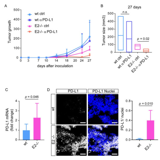 E Emilin2 null mice display improved response to anti-PD-L1 treatment. (A) Growth curve of B16F10 tumors injected in wild type (wt) and Emilin2−/−(E2−/−) mice and treated with anti-PD-L1 blocking antibody (αPD-L1) or isotype control (ctrl). n = 5 mice per group. (B) Tumor size 27 days following injection of B16F10 in mice as in A. Lines represent the median value per group. (C) Relative mRNA expression of PD-L1 in B16F10 tumors grown in wild type (wt) and Emilin2−/−(E2−/−) mice. n = 5 mice per group. (D) Representative images (left) and quantification (right) of the PD-L1 (white) signal in melanomas developed in wild type (wt) and Emilin2−/−(E2−/−) mice. Blue: nuclei; scale bar = 100 μm. n = 5 mice per group. n.s.–not significant. Graphs represent the mean ± SD. p-values were obtained using the paired Student’s t-test.