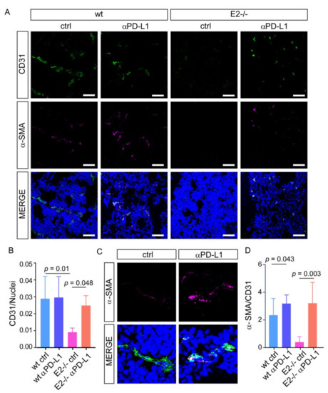 PD-L1 blockage induces vessel normalization in tumors grown in Emilin2−/− mice. (A) Representative images of CD31 (green, endothelial cells) and α-SMA (magenta, pericytes) staining performed on melanomas developed in wild type (wt) and Emilin2−/− (E2−/−) mice treated with the anti-PD-L1 blocking antibody (αPD-L1) or the isotype control (ctrl). Blue: nuclei; scale bar = 100 μm. n = 5 mice per group. (B) Quantification of the relative CD31 staining in tumors from the experiment reported in A. (C) Representative images of the CD31 (green) and α-SMA (magenta) staining performed on melanomas developed in Emilin2−/− (E2−/−) mice treated with anti-PD-L1 blocking antibody (αPD-L1) or isotype control (ctrl). Blue: nuclei. (D) Quantification of α-SMA staining relative to CD31 in tumors as in A. n = 5 mouse per group. Graphs represent the mean ± SD. p values were obtained using the one-way ANOVA Test.