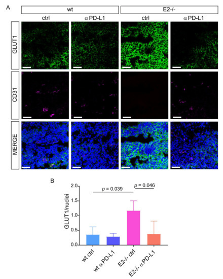 The blockage of PD-L1 is associated with reduced tumor hypoxia. (A) Representative images of GLUT1 (green) and CD31 (magenta) staining performed on melanomas developed in wild type (wt) and Emilin2−/−(E2−/−) mice treated with the anti-PD-L1 blocking antibody (αPD-L1) or the isotype control (ctrl). Blue: nuclei; scale bar = 100 μm. n = 5 mice per group. (B) Quantification of the relative GLUT1 staining in tumors as in A. n = 5 mice per group. Graphs represent the mean ± SD. p values were obtained using the one-way ANOVA Test.