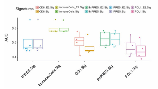 Gene expression signatures have the potential to improve the prediction of the biological behavior of melanoma by objectively identifying the “high risk” patients [26]. To validate the value of EMILIN2 as a biomarker to identify the putative responders to immunotherapy, the evaluation of the EMILIN2 gene expression was added to previously published predictive signatures. To this end, we analyzed three independent gene expression datasets of melanoma patients (GSE91061, PRJEB23709, and MGSP datasets) as described by Xiong D. and co-authors [27]. The ROC analysis showed no increase in terms of area under the curve(AUC) when EMILIN2 was included in gene signatures comprising a large number of genes, i.e., IMPRES and IPRES, whereas the inclusion of EMILIN2 could significantly improve the predictive value of signatures comprising a restricted number of genes, i.e., the CD8 and PD-L1 signatures (Figure 7). Taken together, these results demonstrate that the expression of EMILIN2 can impact the efficacy of the treatments affecting both vascular efficiency and immunotherapy.