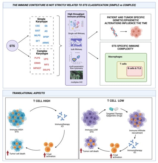 Besides the genetic approaches, immunohistochemistry (IHC) remains a fundamental technique to investigate the TME. The recent development of high-throughput multiplex IHC, able to dissect multiple markers on a single slide, and of related digital imaging analysis systems has certainly boosted the potentiality of this technique. Moreover, IHC is used as either a standalone approach or often applied to validate transcriptomic data, allowing analysis of protein expression on intact tissue sections. This gives crucial information on the co-expression profiles of different immune markers and on their reciprocal intra-tumoral cellular distribution [,]. These approaches have contributed to underline the association between specific pattern of immune infiltration and patient survival. In the next paragraphs, we will depict the current scenario of TME studies in complex and simple karyotype sarcomas and we will discuss how TME is influenced by tumor genetics, also within the same histological sarcoma subtype (Figure 1).