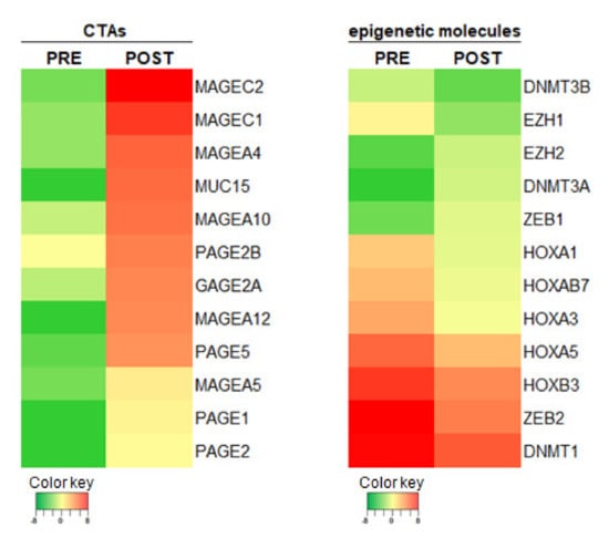 Genes modulated by imatinib in FS-DFSP. Heatmaps showing the expression levels of selected genes encoding cancer testing antigens (CTAs) or epigenetic molecules determined by RNAseq analysis of FS-DFSP pre- and post-imatinib treatment.