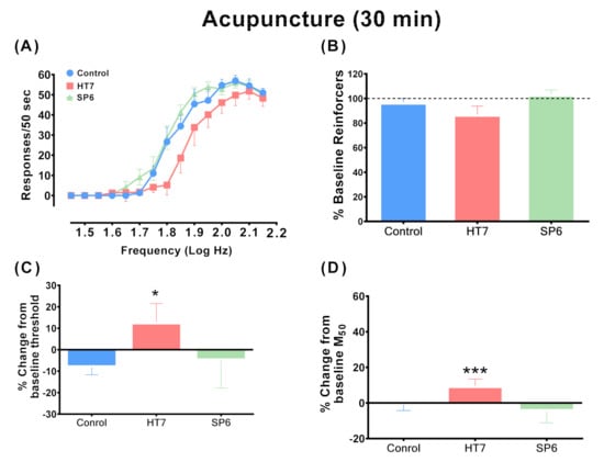 The effects of acupuncture on intracranial self-stimulation during 30 min test sessions in drug-naïve rats. (A) Response rates on wheel turning (per 50 s) as a function of stimulation frequency after acupuncture treatment. Abscissae: Frequencies of electrical brain stimulation in log Hz. Ordinates: Mean responses during each frequency trial after acupuncture. The percentage baseline reinforcer values (B), intracranial self-stimulation (ICSS) reward thresholds (C) and M50 values (D) after acupuncture are also shown. The reinforcer percentages are expressed as percentages of baseline total stimulations across all frequencies of brain stimulation per test. Each point represents a mean ± SEM change from baseline. Control group, n = 7; HT7 group, n = 6; SP6 group, n = 7; * p < 0.05, *** p < 0.001 compared to the control group; post-hoc LSD test.