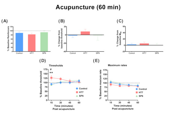 Effects of acupuncture on intracranial self-stimulation during the 1 h test sessions in drug-naïve rats. The percentage baseline reinforcer values (A), intracranial self-stimulation (ICSS) reward thresholds (B) and M50 values (C) after acupuncture are also shown. The reinforcer percentages are expressed as percentages of baseline total stimulations across all frequencies of brain stimulation per test. Time (pass)-dependent effects of acupuncture on ICSS thresholds (D) and maximum rates (E). Each point represents a mean ± SEM change from baseline. Control group, n = 7; HT7 group, n = 6; SP6 group, n = 7, ** p < 0.01 compared to the control group; post-hoc LSD test. # p < 0.05 compared to the SP6 group.