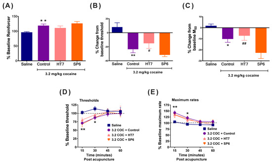 Effects of acupuncture on the cocaine (3.2 mg/kg)-induced shifts in the percentage baseline reinforcer values (A), the intracranial self-stimulation (ICSS) reward thresholds (B) and the M50 values (C). Data are expressed as the means of those derived during 1 h test sessions. Time (pass)-dependent effects of combined treatment with acupuncture and cocaine on ICSS thresholds (D) and maximum rates (E). Each point represents a mean ± SEM change from baseline. Saline group; n = 7; control group, n = 8; HT7 group, n = 7; SP6 group, n = 7; * p < 0.05, ** p < 0.01 compared to the saline group; post-hoc LSD test. # p < 0.05, ## p < 0.01 compared to the SP6 group.