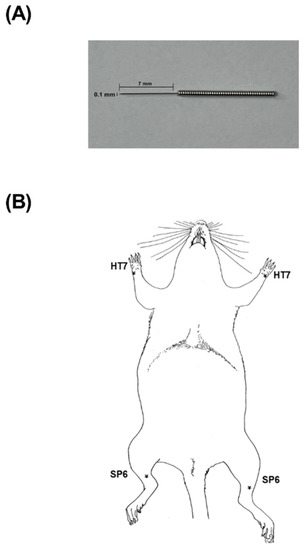 A shape of acupuncture needle (A) and the anatomical location of acupuncture points stimulated in rats (B).