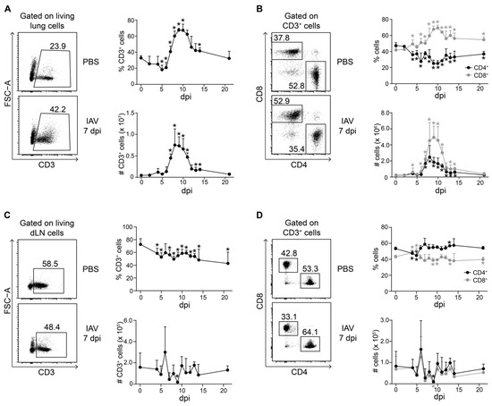 In summary, our data show that the accumulation of CD3+ T cells in IAV-infected lungs is accompanied by a durable change in the ratio of CD4+ to CD8+ T cells, while only mild, transient changes were observed in dLNs.