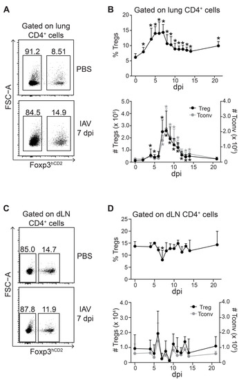 Peak of Treg accumulation coincides with that of Tconv in IAV-infected lungs. Foxp3hCD2 × Rag1GFP reporter mice were infected with IAV and analyzed at indicated dpi. Lungs and dLNs were collected and prepared, and single-cell suspensions were restimulated and subsequently analyzed by flow cytometry; (A) Representative dot plots depict frequency of Foxp3hCD2+ Tregs and Foxp3hCD2- Tconv among CD4+ T cells in lungs of PBS-treated and IAV-infected mice (7 dpi); (B) Graphs summarize frequencies (top) and absolute numbers (bottom) of Tregs (black filled circles) and Tconv (gray filled circles); (C) Representative dot plots depict frequency of Foxp3hCD2+ Tregs and Foxp3hCD2- Tconv among CD4+ T cells in dLNs of PBS-treated and IAV-infected mice (7 dpi); (D) Graphs summarize frequencies (top) and absolute numbers (bottom) of Tregs (black filled circles) and Tconv (gray filled circles). Data were pooled from two to three independent experiments, which included 4–10 mice per group, and presented as mean + SD. Mann–Whitney test was used to calculate statistical significance by comparing values from untreated animals (for lung samples) or PBS-treated animals (for dLN samples) (0 dpi) with values from IAV-infected mice (2 to 21 dpi). Significant changes are indicated by an asterisk.