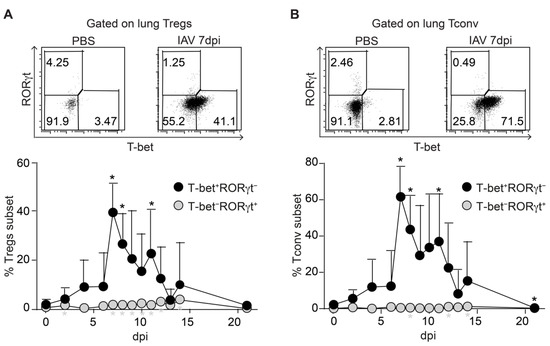 Lung Tregs show a dominant T-bet+ phenotype during IAV infection. Foxp3hCD2 × Rag1GFP reporter mice were infected with IAV and analyzed at indicated dpi. Lungs were collected and prepared, and single-cell suspensions were restimulated and subsequently analyzed by flow cytometry. (A) Representative dot plots depict T-bet and RORγt frequencies among gated Foxp3hCD2+ Tregs from lungs of PBS-treated and IAV-infected mice (7 dpi). The graph summarizes frequencies of T-bet+RORγt− Tregs (black filled circles) and T-bet−RORγt+ Tregs (gray filled circles) in lungs collected from IAV-infected mice at the indicated dpi; (B) Representative dot plots depict T-bet and RORγt frequencies among gated Tconv from lungs of PBS-treated and IAV-infected mice (7 dpi). The graph summarizes frequencies of T-bet+RORγt− Tconv (black filled circles) and T-bet−RORγt+ Tconv (gray filled circles) in lungs collected from IAV-infected mice at the indicated dpi. Data were pooled from two independent experiments, which included 5–9 mice per group, and presented as mean + SD. Mann–Whitney test was used to calculate statistical significance by comparing values from untreated animals (0 dpi) with values from IAV-infected mice (2 to 21 dpi). Significant changes are indicated by an asterisk.