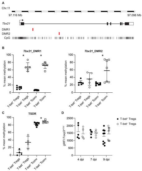 We next analyzed the methylation status of the TSDR to assess the stability of Foxp3 expression [28], as it had been reported that the expression of T-bet in Tregs can affect the size of the Treg population [31]. Interestingly, the TSDR methylation status was different between T-bet+ and T-bet− Tregs. While T-bet+ Tregs exhibited an almost completely demethylated TSDR, T-bet− Tregs showed a trend for an increased TSDR methylation (p = 0.057) (Figure 4C, Supplementary Table S1), indicating a higher stability of Foxp3 expression in T-bet+ Tregs. Yet, the observed epigenetic differences in T-bet+ and T-bet− Tregs did not result in differential Foxp3 expression levels 4, 7 or 9 dpi (Figure 4D). As expected, both T-bet+ and T-bet− Tconv were strongly methylated at the TSDR, with T-bet− Tconv even showing a significantly stronger methylation (Figure 4C).