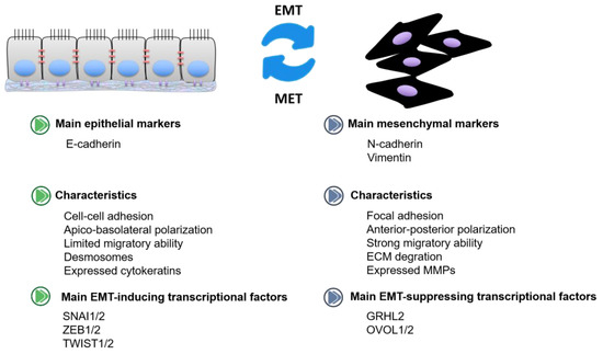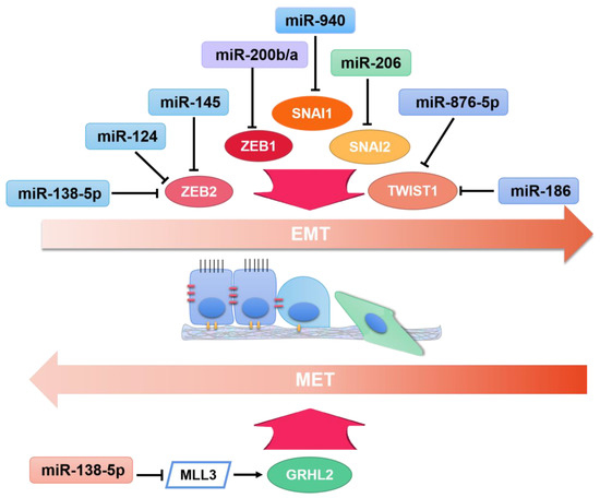 Epithelial–mesenchymal transition (EMT) refers to a process by which epithelial cells change into mesenchymal stem cells with an increase in migratory and invasive capacities [1]. EMT has been categorized into three different subtypes based on the distinguished biological settings as well as functional consequences. Among them, the “type 3” is associated with cancer development, also called as oncogenic EMT (Figure 1). Epithelial-like cells are non-mobile with adherent junctions, while mesenchymal-like cells, devoid of cell polarization, could promote the invasion and migration of primary tumor cells from one site to a distant site [2]. E-cadherin is considered as the epithelial marker, modulating cell–cell adhesion [3]. N-cadherin and vimentin are identified as mesenchymal markers. E-cadherin to N-cadherin switch in cancer leads to a more aggressive migration, invasion, and metastasis [4]. Snail and Slug transcription factors could promote epithelial cells migrating and translating into mesenchymal cells via inducing an E-cadherin to N-cadherin switch [5,6]. The mesenchymal-to-epithelial transition (MET) is the opposite process of EMT, namely, converting mesenchymal cells to epithelial cells [7]. MET allows cancer cells to colonize and form a potentially deadly metastatic lesion at the secondary tumor site [8]. EMT transcription factors (EMT-TFs) coordinate the EMT process. Among them, EMT inducers (SNAI1/2, ZEB1/2, TWIST1/2, etc.) are the most widely studied, with the capacity to suppress E-cadherin and promote mesenchymal transition [9]. In addition, some transcription factors identified as EMT suppressors (GRHL2, OVOL1/2, etc.) could drive the MET process [10]. According to the bioinformation analysis, GRHL2 is associated with epithelial characteristics across various cancers, inducing mesenchymal phenotypes [11]. Meanwhile, OVOL proteins function as the suppressors of EMT-inducing transcription factors and deletion of OVOL1/2 will result in EMT progression [12].