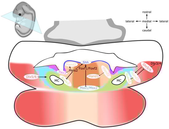 Schematics of a frontal section through developing oral cavity of a mouse embryo at E12. Dlx5/Dlx6 are expressed in ectomesenchyme of the mandibular process and the hyoid arch. Hand1/Hand2 and Meis2 are expressed in ectomesenchyme in the medial region of the mandibular process and the hyoid arch, which also includes the lingual ectomesenchyme. Msx1 and Runx2 are expressed within the primordium of prospective dentary bone. Pax3 is expressed in the ectomesenchyme around the alveolingual sulcus, which represents an anatomical boundary between the dentary bone and tongue. Shh is expressed in the lingual epithelium, whereas Foxf1/Foxf2 are expressed in the lingual ectomesenchyme. Abbreviations: E, embryonic day; MC, Meckel’s cartilage. Expression domains of genes written in black text are not highlighted in the figure.