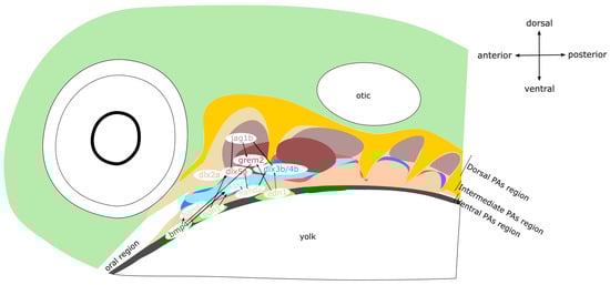 Dlx genes are under the control of Edn1 and Bmp signalling []. The genome of zebrafish contains four bigene dlx pairs—dlx1a/dlx2a, dlx3b/dlx4b, dlx5a/dlx6a, and dlx2b/dlx4a []. Along the dorsoventral axis of PAs, dlx3b/dlx4b and dlx4a can be detected in the intermediate region. While dlx2a is expressed in the dorsal region of PAs, dlx5a/dlx6a are found in the ventral region and the intermediate region of PAs (see Figure 2). The expression of dlx2b is excluded from the first two PAs. In the ventral region of PAs, dlx genes are repressed by hand2 []. Double knockdown of dlx1a/dlx2a causes defects in the dorsal pharyngeal cartilages (palatoquadrate and hyosymplectic cartilages), bearing similarities to murine Dlx1/Dlx2 mutants [,,]. The patterning of mandibular and hyoid arch hinge regions, the opercle, and branchiostegal rays is influenced by dlx5a, dlx3b, and dlx4b. Interestingly, single knockdown of dlx5a, dlx3b, or dlx4b does not produce any changes in the pattern of expression. Conversely, simultaneously knocking down all of them leads to the loss of hinge region joints and fusion of the opercle with branchiostegal rays []. Taken together, dlx1a and dlx2a control the patterning of the dorsal region in the mandibular and hyoid arches, whereas both dlx3b/dlx4b and dlx5a/dlx6a regulate the development of intermediate region. The expression of dlx genes in the zebrafish is in accordance with the mouse, as Dlx1/Dlx2 govern morphogenesis in the dorsal region of PAs, which equals the upper jaw region, the styloid process, and the stapes, whilst Dlx3/Dlx4 and Dlx5/Dlx6 establish the intermediate and ventral region of PAs, which comprises the presumptive lower jaw and lesser horns of the hyoid. Therefore, the patterning along the anterior–posterior and dorsal–ventral axes in mice and zebrafish is under the control of a common regulatory cascade, EDN–HAND–DLX (see Figure 1 and Figure 2).