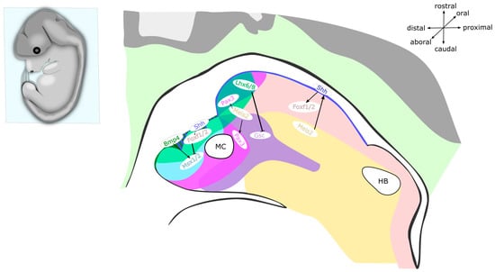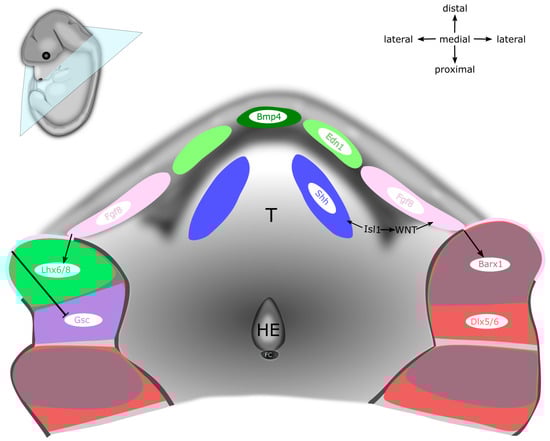 Alongside transcription factors, numerous protein ligands also serve essential functions during the patterning of mandibular and hyoid arches. Ffg8 is expressed in the oral epithelium from which it diffuses into the underlying ectomesenchyme. Fgf8 is a key survival factor of the NC because its ablation in the oral ectoderm leads to massive apoptosis in the mandibular arch, as well as to complete loss of the proximal mandibular structures []. Moreover, Fgf8 determines the rostral–caudal axis of the mandibular arch. The expression of Fgf8 in the oral surface ectoderm induces the expression of transcription factors Lhx6/Lhx8 in the rostral mandibular mesenchyme. Concomitantly, this results in the restriction of Goosecoid (Gsc) expression in the caudal mandibular mesenchyme, therefore establishing the subdivision of the mandibular process into the rostral and caudal domain (see Figure 3 and Figure 4) []. At the same time, FGF8 acts together with BMP4 to specify the proximal–distal axis by regulating the expression of specific homeodomain-containing transcription factors in the ectomesenchyme, which subsequently defines the positional identity of individual teeth. Barx1 induced by FGF8 in the proximal region determines the molar identity, whereas BMP4-regulated Msx1 in the distal aboral region specifies the prospective incisors. Intriguingly, early mandibular epithelium can organize dental mesenchyme and dental papilla in the mouse hyoid arch, indicating a common regulatory circuit between the mandibular and hyoid arches during the early stages of PA development []. In the mandibular process, maintenance of Fgf8 expression is ensured by transcription factor PITX2, which simultaneously represses Bmp4 expression. Consistently, the expression of Fgf8 and its target genes, such as Barx1 and Pitx1, is severely reduced in Pitx2-null mutants, whereas the expression of Gsc in the mandibular process is expanded rostrally. Moreover, since high doses of Pitx2 are required for repression of BMP signalling, the expression of Bmp4, Msx1, and Msx2 is expanded as well. As a result, disrupted signalling in the mandibular arch due to the mutation in either Pitx1 or Pitx2 leads to a severe micrognathia, while single Pitx1 mutants also suffer from the bifurcation of the tongue and a novel bone deposition around Meckel’s cartilage [,,].
