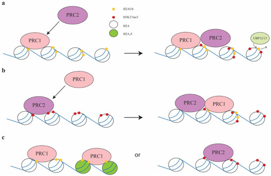 Model of PRC1 and PRC2 interactions. (a) PRC1 acts first and induces ubiquitination of H2A. PRC2 is recruited after PRC1, and H3K27me3 is deposited. H2Aub is then removed by UBP12/13 to maintain H3K27me3. (b) PRC2 acts first and deposits H3K27me3; PRC1 is recruited by H3K27me3; and H2A is ubiquitinated afterwards. (c) PRC1 and PRC2 act independently of each other. Both H2A and H2A.Z could be ubiquitinated.