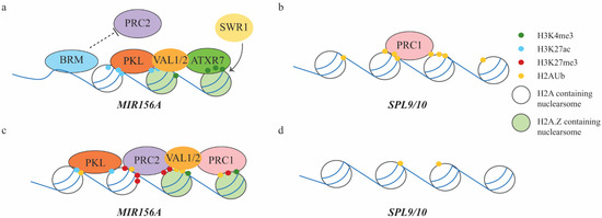 In Arabidopsis, miR156 is encoded by eight genes, MIR156A-MIR156H. Genetic analysis indicates that MIR156A/MIR156C are the major sources for mature miR156 [62,72]. Mutant screening led to the discovery that PKL, a CHD3 chromatin remodeling factor mentioned previously, regulates vegetative phase change. Nucleosomes are physical barriers for RNA polymerase II, so chromatin remodeling factors likely affect gene transcription by modulating nucleosome occupancy near the transcription start site [80]. PKL promotes the +1 nucleosome occupancy at MIR156A/MIR156C [75]. During vegetative phase change, primary transcripts of MIR156A/MIR156C are temporally downregulated, correlating with the temporal decrease in H3K27ac, an active marker, and temporal increase in H3K27me3, a repressive marker [52,53]. It has been found that PKL interacts synergistically with PRC2 component SWN to modulate the levels of H3K27ac and H3K27me3 at MIR156A/MIR156C [75]. In contrast to PKL, another chromatin remodeling factor and component of the SWI2/SNF2 chromatin remodeling complex, ATPase BRAMAH (BRM) acts antagonistically to SWN, preventing the +1 nucleosome accumulation and allowing active transcription of MIR156A [77]. Therefore, PKL, BRM, and PRC2 are involved in mediating temporal deposition of H3K27me3 at MIR156A/MIR156C (Figure 3a,c). BRM prevents the binding of PRC2 at a flowering repressor SHORT VEGETATIVE PHASE [81], and it is likely that BRM may prevent the binding of PRC2 at MIR156A. However, it is still unknown how PKL mediate the activities of PRC2.