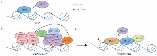 Mutations in EMF1 and EMF2 result in precocious upregulation of floral activators such as FLOWERING LOCUS T (FT), SUPPRESSOR OF OVEREXPRESSION OF CO1 (SOC1) and AGAMOUS (AG), and flowering right after germination without developing any true leaves [15,20,32,88,89], suggesting that PRC1 and PRC2 are required to suppress precocious early flowering (Figure 4b). Consistent with this, mutations in CLF resulted in early flowering, likely caused by reduced levels of H3K27me3 at SOC1, FT, AG, AGAMOUS-like 17 (AGL17), AGL19, AGL24, and AGL71, and consequently upregulation of these genes in the shoot [90,91,92,93]. On the other hand, the floral repressor SVP is devoid of H3K27me3 to prevent early flowering [81]. BRM binds to SVP directly to prevent the binding of PRC2 and deposition of H3K27me3 at SVP to prevent early flowering [81] (Figure 4a). Upon floral induction, the floral activators are upregulated for reproductive success. The H3K27me3 levels in FT and SOC1 are therefore reduced by histone demethylase RELATIVE OF EARLY FLOWERING 6 (REF6) (Figure 4b). REF6 encodes a Jumonji domain-containing protein and loss of function REF6 is late flowering while overexpression of REF6 resulted in early flowering [94]. The zinc finger domain of REF6 is essential for its binding to the CTCTGYTY motif (where Y represents T or C) of its targets [95]. REF6 also physically interacts with BRM, and they colocalize at 1276 targets in Arabidopsis to prevent further PRC2 binding [95,96] (Figure 4c).