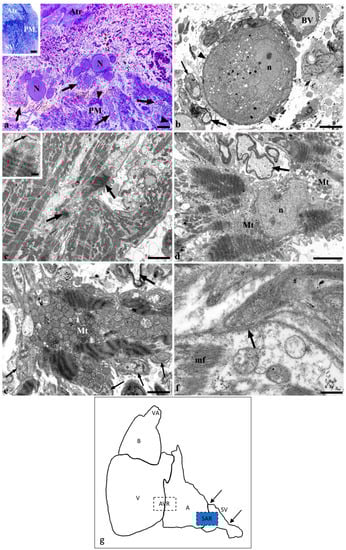 Histology and structure of the sinoatrial region and pacemaker area. (a) Semithin section. Sinus venosus wall. Large neuronal bodies (N) locate between the atrial myocardium (Atr) and the pacemaker (PM) area. The pacemaker tissue contains loosely organized myocardial bundles, small blood vessels (arrowheads) and abundant nerve bundles (arrows). Other nerve bundles locate close to the neuronal bodies. Inset of a: semithin section. Low magnification of the sinoatrial region. The atrium (Atr) and sinus venosus (SV) are separated by connective tissue. The pacemaker area (PM) is indicated. (b) TEM. A neuronal body showing nucleus (n) and nucleolus, lysosomal bodies and supporting glia (arrowheads) is surrounded by blood vessels (BV) and myelinated (thick arrow) and unmyelinated (thin arrow) nerve fibers. (c) TEM. The cytoplasm of the central myocyte shows two small areas of myofibrillar condensation (arrows). The surrounding cells show myofibrils with a regular appearance. Inset of c: TEM. Detail of myofibrillar condensation. The same myofibril shows normal Z band (arrow) and tightly packed myofilaments with condensed Z bands. (d) TEM. Myocardial cells show condensed myofibrils and regular mitochondria (Mt). Moreover, n is the myocardial nucleus; arrow is the myelinated nerve fiber. (e) TEM. A large cytoplasmic area contains condensed myofibrils surrounded by tightly packed rounded mitochondria (Mt). Note the presence of one myelinated (thick arrow) and several unmyelinated (thin arrows) nerve fibers. (f) TEM. One unmyelinated fiber appears in close apposition (arrow) with the myocardial cell surface. Specialized junctions are absent. mf indicates myofibrils. (g) Schematic drawing of the cardiac regions: VA, ventral aorta; B, bulbus arteriosus; V, ventricle; AVR, atrioventricular region; A, atrium; SAR, sinoatrial region; SV, sinus venosus. The area highlighted in blue indicates the region of observation. Scale bars: a: 50 µm; inset of a, 100 µm; b: 5 µm; c, 3 µm; inset of c, 500 nm; d, 3 µm; e, 2 µm; f, 500 nm.