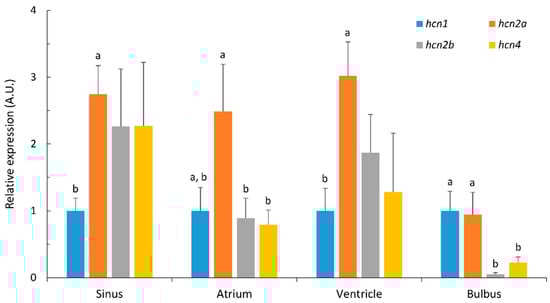 Relative expression levels of hcn1, hcn2a, hcn2b and hcn4 in sinus, atrium, ventricle and bulbus arteriosus in Atlantic cod. Transcripts were quantified by qPCR, normalized using the geometric average of ubi and eef1 expression and shown as relative values compared to hcn1 transcript levels in each sample. Data are expressed in arbitrary units (A.U.) as mean ± S.E. (n = 5). Different superscript letters (a, b) indicate significant differences in transcript levels between hcn paralogues in each heart region. Differences in hcn transcript levels within each heart area were determined by one-way ANOVA with a Holm–Sidak post hoc test (p < 0.05). Kruskal–Wallis one-way ANOVA on ranks with Dunn’s post hoc test was performed when the data did not meet the normality and equal variance requirements.