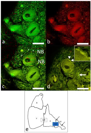 The immunohistochemical procedures in the present study were similar to those described previously regarding the neuroanatomical studies on the visceral organs in fishes [,,,]. Tissue sections (6 µm) were rinsed in PBS and transferred to a PBS solution containing 2% Triton X-100 (X-100), Sigma-Aldrich), 1% (w/v) bovine serum albumin (BSA, A9576, Sigma-Aldrich), and 1% (v/v) normal goat serum (NGS, G9023, Sigma-Aldrich) for 48 h at 4 °C with agitation; they were then incubated with primary antibodies (Table 1). Primary antibodies were diluted in a solution containing 0.25% Triton X-100, 1% BSA, and 1% NGS in PBS and incubated overnight, then transferred to a solution of PBS containing the appropriate secondary antibody conjugated to AlexaFluor 488 or 555 fluorophores (Life Technologies, Burlington, Canada). The incubation time with secondary antibodies was 1 h. Final rinsing of tissue sections was performed in PBS before mounting with Vectashield (Vector Laboratories Inc., Burlingame, USA) to reduce fluorophore photobleaching.