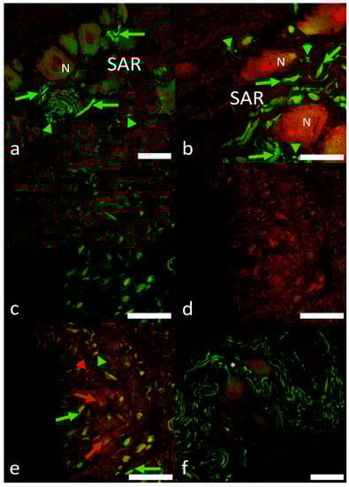 Intense ChAT immunostaining was observed in axonal varicosities interconnecting the neuronal somata. The simultaneous detection of AcT and VAChT demonstrated two distinct populations of neuronal somata (neuron subtypes). A higher number of axon profiles and nerve terminals is noticed in the SAR (Figure 5a,c,d,f). Sometimes AcT-positive large axons, at single pole of soma originating from hillock, were observed (Figure 5f). Most of the clustered neuronal somata are positive to VAChT, and AcT-positive axons appeared to surround these somata (Figure 5f).